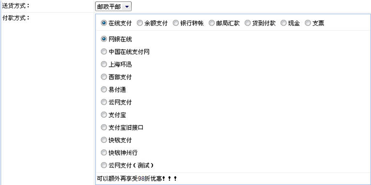 在動易eShop 2007,網(wǎng)店顧客可在所有支付平臺中任意選擇一種來進行貨款支付,見下圖: