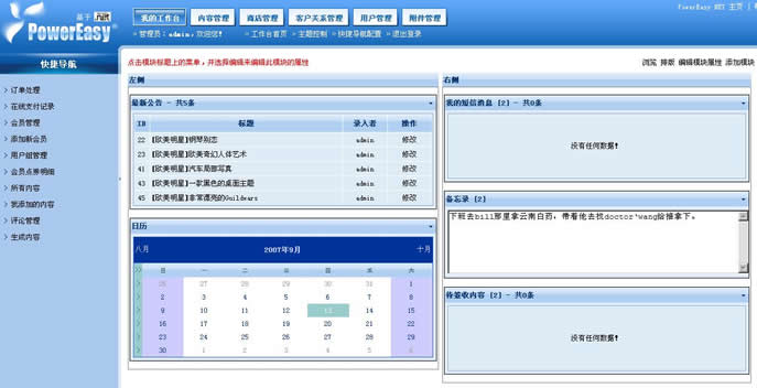 “我的工作臺”采用.Net2.0的WebPart組件來進(jìn)行開發(fā)的,整個操作界面包含三個部分:工作臺導(dǎo)航條、左側(cè)快捷導(dǎo)航、右側(cè)內(nèi)容顯示。通過對三個部分的設(shè)置,管理員登陸后臺便可以清楚的知道待審文章數(shù)量、訂單數(shù)量、付款金額、最近聯(lián)系客戶、發(fā)貨訂單數(shù)、日程等各種日常需要處理的信息。特別是能夠在“我的工作臺”中直接處理如回復(fù)短消息、添加日程、處理訂單、審核文章等相關(guān)信息。