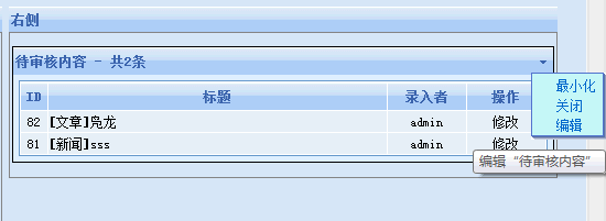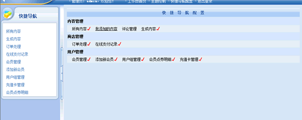 2、可以對左側(cè)快捷導(dǎo)航中的管理項(xiàng)目進(jìn)行預(yù)設(shè),由于采用了ajax技術(shù),在右側(cè)點(diǎn)擊某項(xiàng)內(nèi)容后,左側(cè)的導(dǎo)航將隨著自動增加和減少相應(yīng)管理項(xiàng)目。