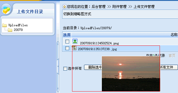 最后,CMS2007的上傳文件功能除了能更加方便地進(jìn)行文件的管理外,還支持在網(wǎng)站后臺(tái)直接對(duì)附件進(jìn)行刪除、上傳等操作,當(dāng)然,對(duì)于圖片類型的附件的系統(tǒng)提供的查看方式也是可視化的(下圖紅色方框是鼠標(biāo)移動(dòng)到附件文件名上時(shí),會(huì)即時(shí)出現(xiàn)該文件的縮略圖)。