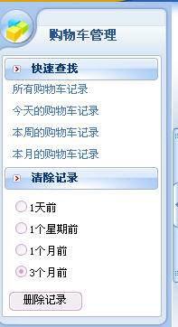 此外,還可以分別快速篩選出今天、本周和本月的購(gòu)物車記錄,如果購(gòu)物車明細(xì)記錄太多,影響了系統(tǒng)性能,或者是購(gòu)物車記錄已經(jīng)不再需要了,還可以批量刪除一定時(shí)間段(1天、1星期、1個(gè)月和3個(gè)月)前的記錄。
