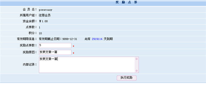 點(diǎn)券可以說(shuō)是用于網(wǎng)站除購(gòu)買(mǎi)商品外其他消費(fèi)的一種虛擬資產(chǎn),可以由管理員任意自定義點(diǎn)券的名稱和單位,如可命名為“動(dòng)易幣”。點(diǎn)券也可以由管理員在會(huì)員注冊(cè)時(shí)候贈(zèng)送;可以用積分或者現(xiàn)金來(lái)進(jìn)行兌換(見(jiàn)圖1);可以由管理員獎(jiǎng)勵(lì);(圖3)
