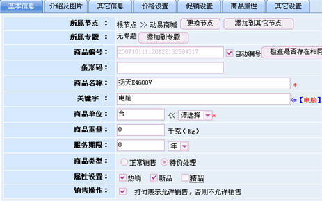 在動(dòng)易eShop2007前臺(tái)商城里分別有五個(gè)商品欄目,代表五種銷售狀態(tài)的商品:最新商品、推薦商品、熱賣商品、精品商品、固頂商品。其中最新商品、熱賣商品和精品商品這三種可以通過(guò)后臺(tái)“添加商品——基本信息——商品屬性設(shè)置”來(lái)設(shè)置。后臺(tái)商品的設(shè)置有三個(gè)選擇:熱銷、新品和精品,分別對(duì)應(yīng)前臺(tái)的熱賣商品、最新商品和精品商品。添加商品時(shí)勾選了哪個(gè)商品屬性,該商品就將自動(dòng)在前臺(tái)對(duì)應(yīng)的商品欄目中顯示。