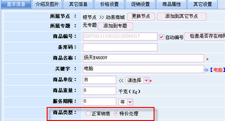 另外,除了這五種銷售狀態(tài)外,動(dòng)易eShop2007還可以設(shè)置正常銷售和特價(jià)商品和這兩種銷售狀態(tài),這是從價(jià)格管理上來(lái)區(qū)分的。這個(gè)可以在后臺(tái)“添加商品——基本信息——商品類型”中進(jìn)行勾選,
