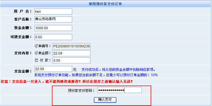 2、當(dāng)用戶使用預(yù)付款(帳戶余額)進行支付的時候,系統(tǒng)將要求輸入支付密碼: