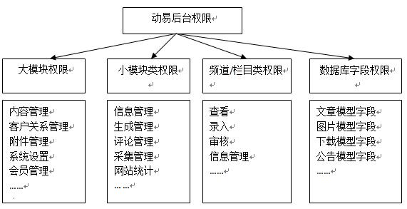 下圖是動易SiteFactory? 角色權限分布圖,包括:大模塊類權限設置、小模塊類權限設置、節(jié)點(頻道、欄目)類權限設置和數(shù)據(jù)庫字段類權限設置。無論是從大到小,從面到點,都為“角色”提供了足夠豐富的權限功能。