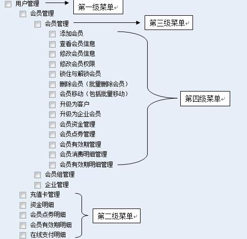 此類權限往往是對“大模塊類權限”的解構,也就是說“大模塊類權限”是由一個個小模塊類權限組合而成的。小模塊類權限往往會含有三級甚至四級的權限細分,如下圖中動易SiteFactory? 的“用戶管理”權限就包含有四級權限細分: