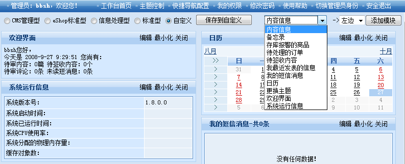 在SiteFactory? CMS 2.0中,開發(fā)組對“我的工作臺”進(jìn)行了比較大的改動,引入了更多的OA功能,比如:自定義界面布局方案、自設(shè)模塊快速添加、待處理信息、備忘錄等功能。同時,也對SiteFactory? CMS 1.0版本中部分UI進(jìn)行了修改,像“模塊添加”功能,由原來“多次點(diǎn)擊——勾選——點(diǎn)擊——保存”的方式,改進(jìn)為“下拉選擇——添加保存”的方式。步驟大大減少,也提高了用戶體驗;另外還有“拖拽(Drag)”布局的速度和UI優(yōu)化、模塊編輯修改樣式等方面的改進(jìn)。