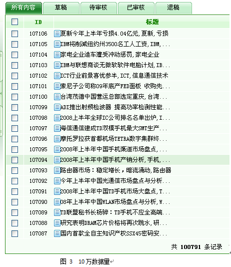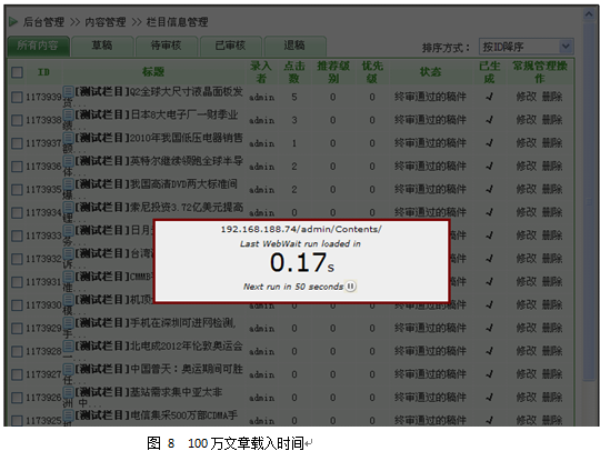 小結:動易SiteFactory的后臺管理可以輕松承載100萬的數(shù)據(jù),并且和10萬數(shù)據(jù)時相比,沒有任何性能上的衰減。無論是10萬數(shù)據(jù)還是100萬數(shù)據(jù),后臺管理的幾個主要頁面的打開時間都在0.2秒以內,可以說是“閃電”來形容,絕對是“飛快”的級別。