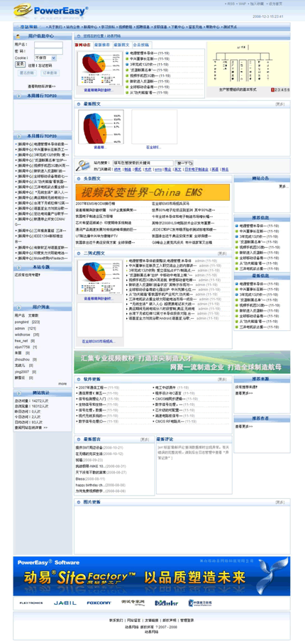 6)為首頁制作一個復雜的模板(調用20個欄目的列表,還有其他各種功能),生成首頁計時。模板的前臺顯示效果見下圖: