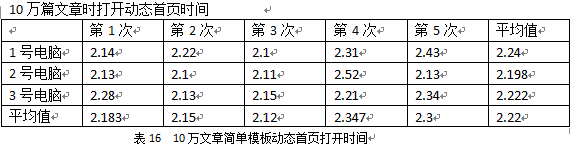 小結:動易SiteFactory2.0的首頁的生成速度可以說用“飛快”來形容,無論是10萬數(shù)據(jù)還是100萬數(shù)據(jù),無論是簡單模板還是復雜模板,首頁的HTML生成速度都在1秒左右。從數(shù)據(jù)中也可以看出來,同樣的模板時,10萬數(shù)據(jù)和100萬數(shù)據(jù)在生成HTML時沒有太大的性能差異,但模板的復雜度則直接影響了生成速度,模板越復雜,調用的標簽越多,性能衰減得越厲害。