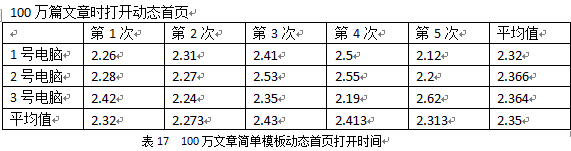 當我們和生成首頁的時間進行對比,我們發(fā)現(xiàn)一個很特殊的現(xiàn)象:生成首頁的時間還小于訪問動態(tài)首頁的時間。這是為什么呢?這是因為本次測試的統(tǒng)計時間是以頁面打開時間為準,這里面包含了三個時間:服務器端的程序執(zhí)行時間+IE下載頁面時間+IE解析頁面時間。生成首頁HTML時,顯示的信息很少,所以后兩者幾乎不用時間;訪問動態(tài)首頁時,因為首頁的信息量大,還有大量圖片等,所以后兩者的時間相對較長。