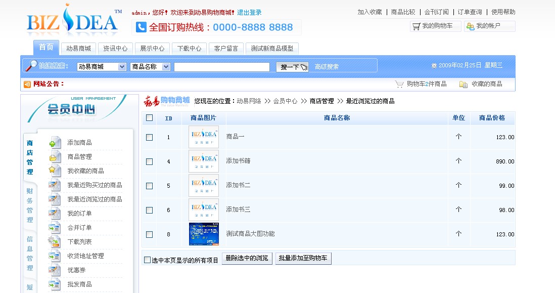 為了提高會員購物體驗,BizIdea2.5版系統(tǒng)在前臺會員中心新增了“我最近瀏覽過的商品”功能,可以對前臺會員所有的商品瀏覽歷史進行記錄。會員可以在會員中心中查看自己曾瀏覽商品的名稱、單位及價格信息,也可直接將商品從列表中刪除或批量添加至購物車。(如圖)