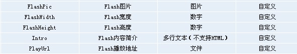 在Flash模型中新增的字段有Flash圖片、Flash寬度、Flash高度、Flash內(nèi)容簡(jiǎn)介、Flash播放地址等,站長(zhǎng)可以利用這些字段來設(shè)置Flash文件的首頁圖片、內(nèi)容簡(jiǎn)介、播放地址、寬高度等等,可以滿足普通Flash模塊構(gòu)建的需求。如果還需要做其他更多個(gè)性化效果或者設(shè)置的話,那就需要大家多動(dòng)動(dòng)腦筋動(dòng)動(dòng)指頭自力更生了哦(*^__^*)