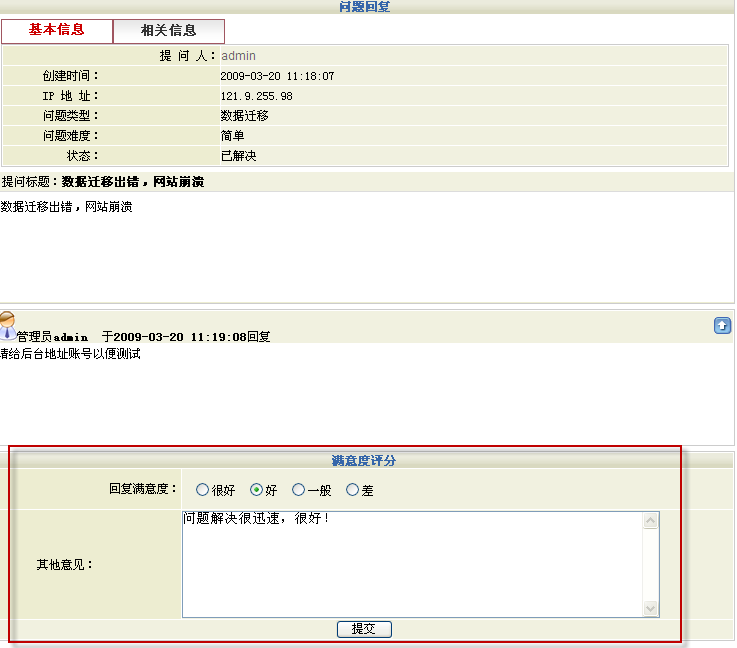 企業(yè)可預(yù)先設(shè)置好不同的問題回復(fù)滿意度評(píng)分選項(xiàng),客戶在問題解決后可對(duì)客服人員的回復(fù)情況進(jìn)行評(píng)分和撰寫意見,從而可以對(duì)企業(yè)客戶人員的服務(wù)質(zhì)量起到更好的監(jiān)督和促進(jìn)作用。