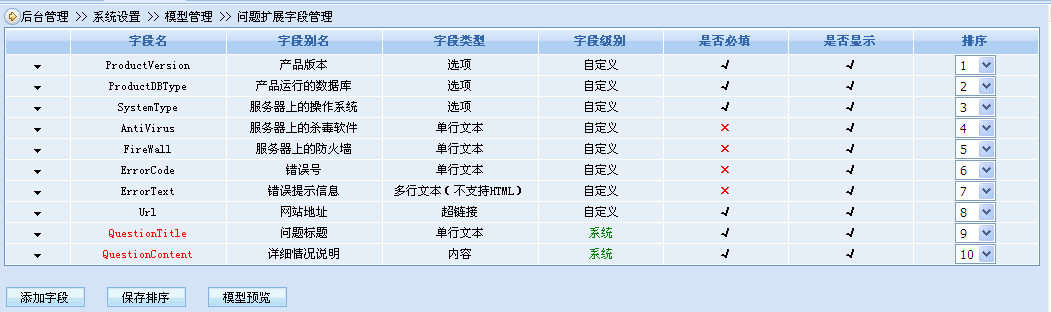 可自定義問答類型,滿足各行業(yè)細(xì)分要求。如在軟件銷售行業(yè)中,將問答類型設(shè)置為產(chǎn)品版本、錯(cuò)誤號(hào)、提示信息等與軟件使用相關(guān)的問答選項(xiàng),可建立軟件公司自己的售后服務(wù)中心(商業(yè)或非商業(yè));又如在硬件銷售行業(yè)中,作為硬件產(chǎn)品的客服中心可以添加硬件的產(chǎn)品型號(hào)、購(gòu)買日期、購(gòu)買地點(diǎn)、故障信息描述等問題模型字段,等等。通過模型強(qiáng)大的自定義字段功能,滿足各種行業(yè)的不同需求。