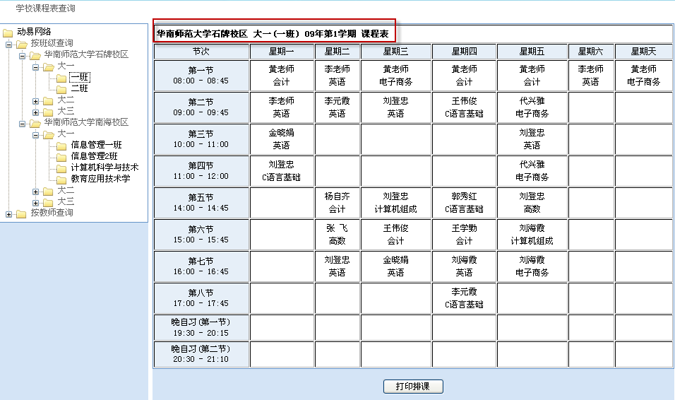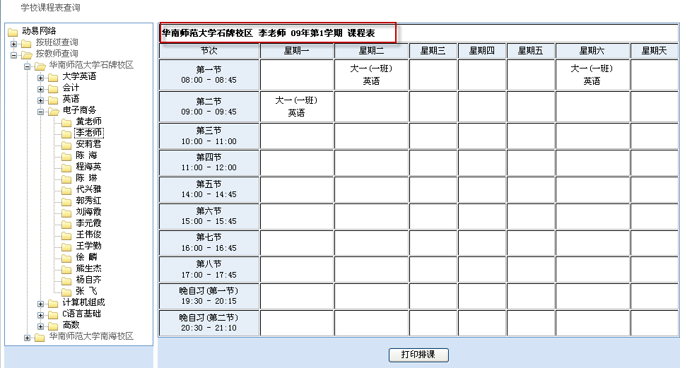 課程查詢系統(tǒng)是在通過互聯(lián)網(wǎng)為教師和學生提供課程表查詢的一個軟件系統(tǒng)。在動易SiteFactory 2.5學校版中,學校工作人員或教師可在系統(tǒng)后臺方便進行排課,而學生和任課教師可以在前臺對自己的課程表進行快捷查詢。