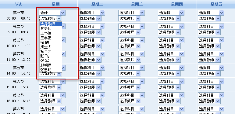 可對學校所有班級的每周課程進行預(yù)先排課,包括課程節(jié)次、上課時間、科目、任課教師等;此外,還可預(yù)先排列多個學期的課程表,如每學期末預(yù)先排列下學期的課程表等。