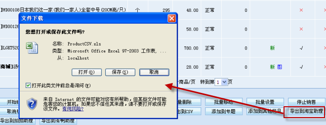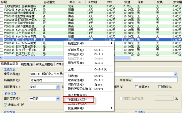 我們先在淘寶助理里把商品數(shù)據(jù)CSV文件導(dǎo)出然后進(jìn)行保存:
