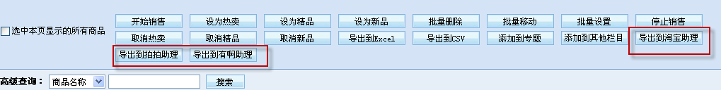 在后臺(tái)商品管理列表界面我們可以看到頁(yè)面底部多了“導(dǎo)出到淘寶助理”、“導(dǎo)出到拍拍助理”、“導(dǎo)出到有啊助理”三個(gè)按鈕,點(diǎn)擊其中任何一個(gè)按鈕便可以將全部商品數(shù)據(jù)以CSV文件形式導(dǎo)出至本地保存,然后再在淘寶\拍拍\有啊等平臺(tái)助理里導(dǎo)入CSV文件即可將商品數(shù)據(jù)全部導(dǎo)入。