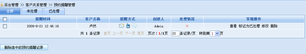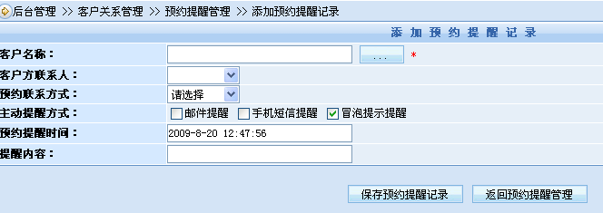 客戶(hù)關(guān)系的良好維護(hù)離不開(kāi)客服人員持續(xù)不斷地定期跟客戶(hù)聯(lián)系,而如果企業(yè)客戶(hù)數(shù)量眾多,每個(gè)客服人員均需負(fù)責(zé)成百上千客戶(hù)的時(shí)候,便有可能發(fā)生不能很好地安排時(shí)間定時(shí)與每一位客戶(hù)進(jìn)行聯(lián)系,以致遺忘掉了其中某些客戶(hù),造成客戶(hù)關(guān)系維護(hù)的中斷,最終造成客戶(hù)的流失。為了盡量避免這一情況的發(fā)生,系統(tǒng)提供了約約提醒功能,客服人員可以事先設(shè)置好與某位客戶(hù)的聯(lián)系預(yù)約信息、時(shí)間和需要提醒的方式;當(dāng)預(yù)約時(shí)間到了之后系統(tǒng)將自動(dòng)以客服人員事先設(shè)置的提醒方式提醒客服人員聯(lián)系客戶(hù),提醒方式可以是郵件、手機(jī)短信或系統(tǒng)后臺(tái)將自動(dòng)彈出提示窗口提示。