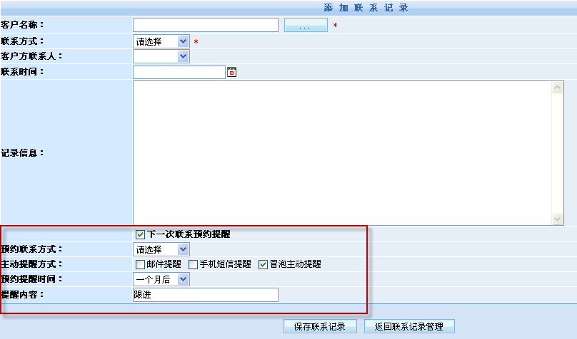 可以對(duì)客服人員對(duì)每個(gè)客戶(hù)的每一次聯(lián)系記錄進(jìn)行管理,包括通過(guò)電話(huà)、QQ、郵件等各種不同方式進(jìn)行的聯(lián)系均可錄入進(jìn)去記錄在案,以方便客戶(hù)人員查看自己所有的客戶(hù)聯(lián)系記錄,更可供相關(guān)企業(yè)管理人員隨時(shí)查看下屬客服人員對(duì)每個(gè)客戶(hù)的聯(lián)系、跟進(jìn)情況。并且,客戶(hù)聯(lián)系記錄還可與預(yù)約提醒配合起來(lái)一起使用,客服人員在每次添加客戶(hù)聯(lián)系記錄時(shí)還可同時(shí)為該客戶(hù)添加下次聯(lián)系的預(yù)約提醒,這樣便大大便捷了客服人員對(duì)客戶(hù)的跟進(jìn)和聯(lián)系。