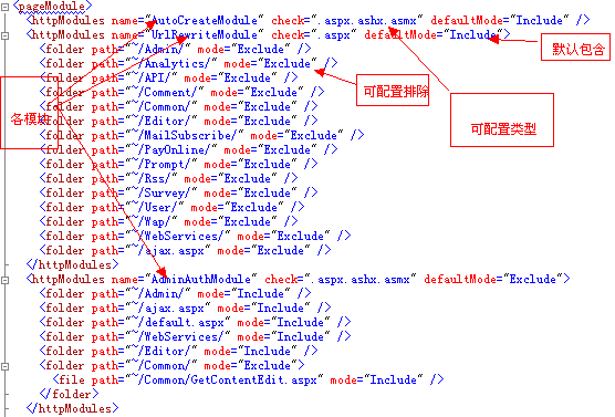 IIS 7 完全整合 .NET 之后,這些 ASP.NET 模塊不只能處理 ASP.NET 網(wǎng)頁程序,也能處理其他如 ASP 程序、PHP 程序或靜態(tài) HTML 網(wǎng)頁,也因為 ASP.NET 的諸多功能已經(jīng)成為 IIS 7 的一部份,因此 ASP 程序、PHP 程序或靜態(tài) HTML 網(wǎng)頁等類型的要求,也能使用像是Forms認證(Forms Authentication)或輸出緩存(Output Cache)等。因此,默認情況下HTTP Module需要處理更多沒有必須的工作。如css、jpg、gif、html等某些不需要HTTPModule檢查的請求會浪費系統(tǒng)很多沒有必要的性能。為了解決這個問題,我們對HTTPModule模塊化和可配置等改進。重新合理調(diào)整HTTPModule的功能模塊,使其各施其職。HTTPModule的可配置化,可以隨時根據(jù)不同的需求進行調(diào)進。